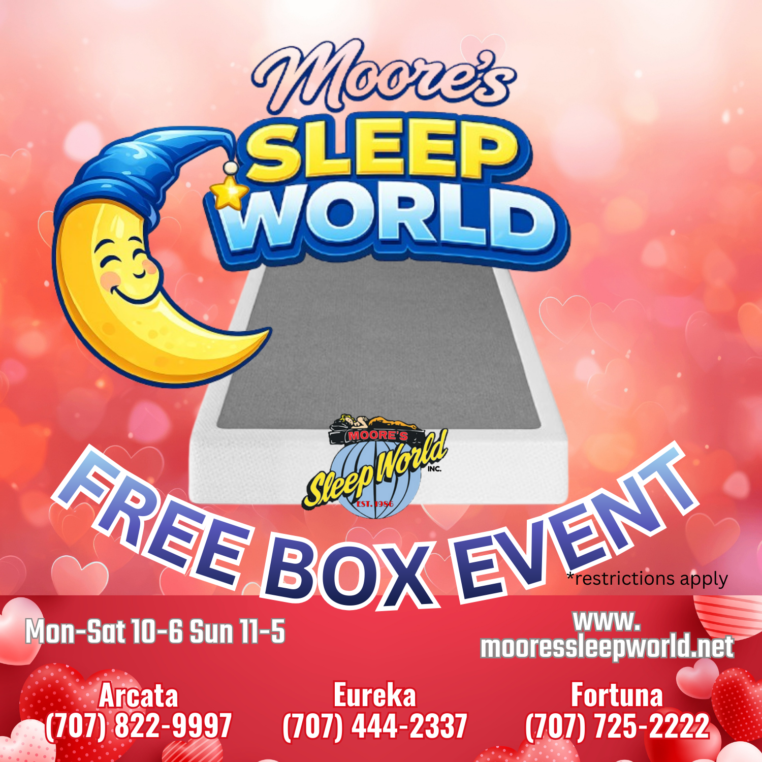 Moore’s Sleep World Inc. is Humboldt County’s ONLY full service mattress store. We specialize in beds, mattresses, foundations, support units, pillows, mattress protectors and adjustable bed bases to help you find the right sleep system for your specific needs and body type. ALL of these items mentioned can be sold separately.